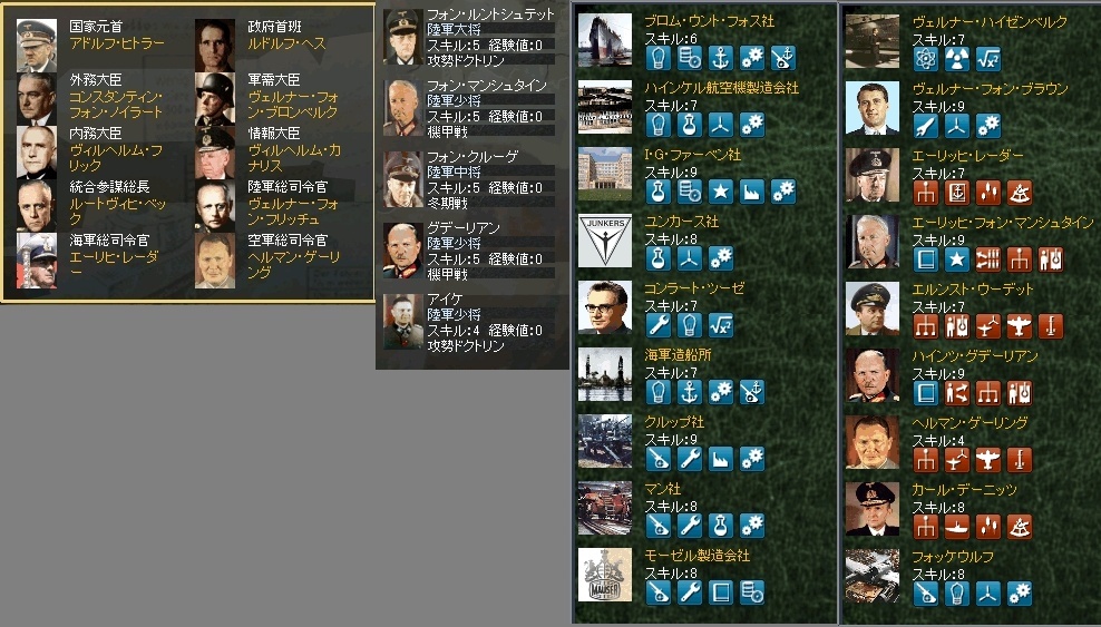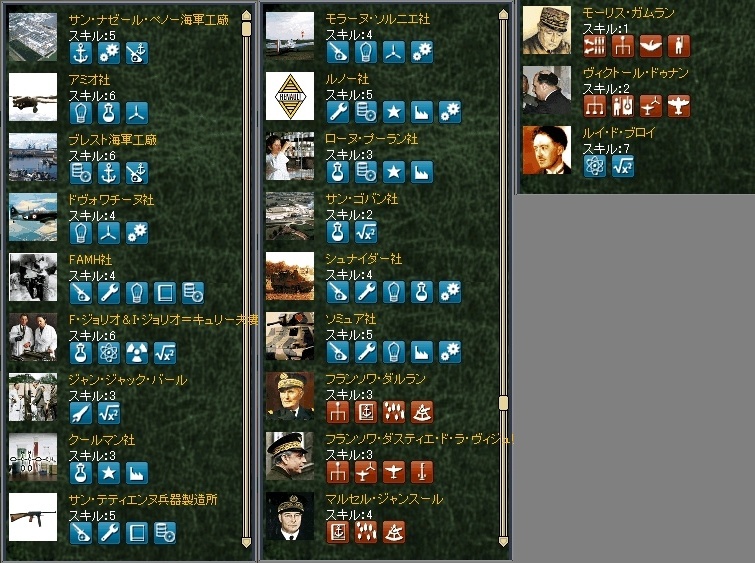 次は研究機関と陸軍将軍。将軍はスキル順に並び替えたのでトップ5(のはず)